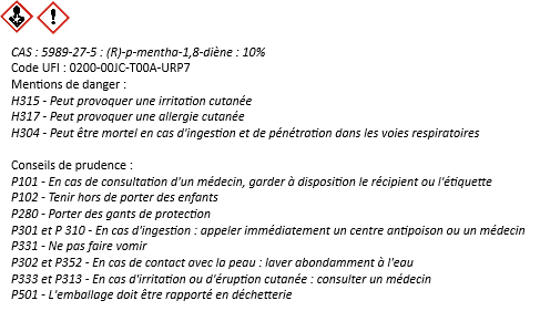 Naturel ne veut pas dire sans danger. Notre Huile Naturelle Haute Protection contient du D-limonène qui est un solvant naturel présent dans les peaux d’agrumes comme l’orange ou le citron. Avez-vous déjà pressé une peau de mandarine auprès d’une bougie à Noël ? Ça crépite et fait de petites étincelles… Vous connaissez donc déjà cet hydrocarbure naturel (terpène). Il est également présent chez les conifères mais aussi dans de nombreux légumes comme le cornichon ou le céléri. L’utilisation de notre Huile Naturelle Haute Protection doit donc se faire en respectant certaines précautions.